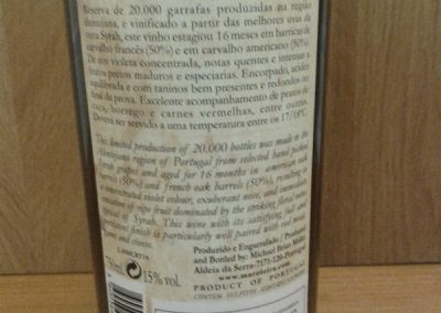 É sempre uma aposta ganha. Não vou dizer que é o melhor syrah (100%) de Portugal, mas, de facto, apetece-me dizê-lo. Cor retinta; aroma muito intenso a ameixas maceradas, com o carvalho também a aparecer. Na boca é muito potente, muito encorpado e muito saboroso. É um vinho com alma sem dúvida, mais potente que elegante é verdade, mas que dá muitíssimo prazer a beber. O final está marcado ligeiramente em demasia barrica, o que era dispensável, mas nós perdoamos.