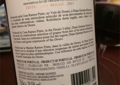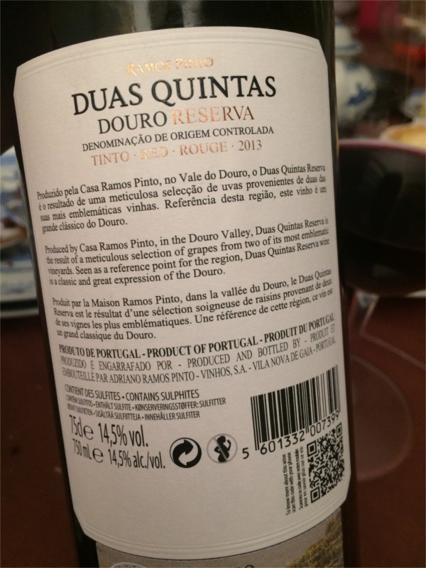 Aproveitei, mais uma vez, as promoções periódicas de 25% de desconto em vinhos de determinada região da grande superfície Continente para comprar este Duas Quintas Reserva. A casa Ramos Pinto tem uma história extraordinária, que respeito imensamente. Sem falar de Portos, lembro-me em particular de uma garrafa magnum Duas Quintas de 1994 que provei há uns 5 anos que estava fantástica. Este 2013 só tem um defeito: é demasiado jovem. Tem todas as qualidades, mas a tosta da madeira sobrepõe-se à fruta que é também, talvez, directa de mais. Os taninos estão ainda bem verdes, cheios de grão. Lá no fundo, descobrem-se notas finas de violetas e de especiarias que dão alguma elegância ao vinho. Mas é preciso dar-lhe tempo. Dentro de 5 anos, seguramente, será um melhor vinho, com os elementos todos mais bem casados.